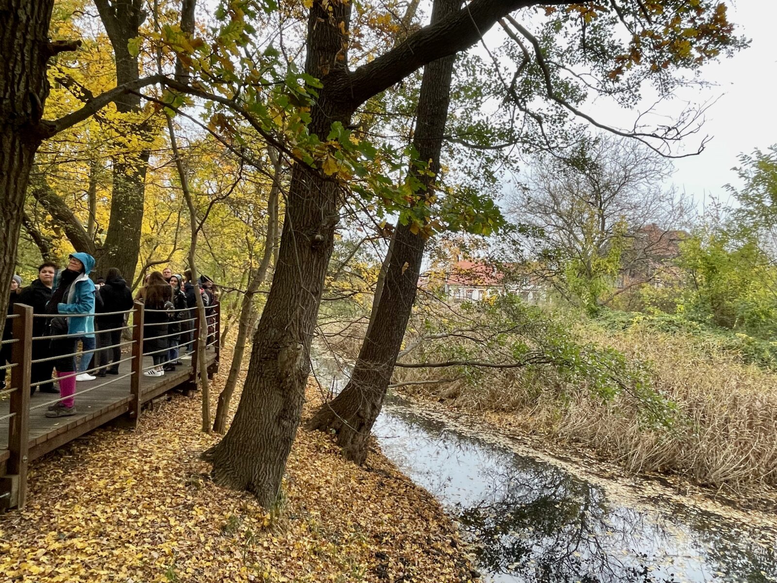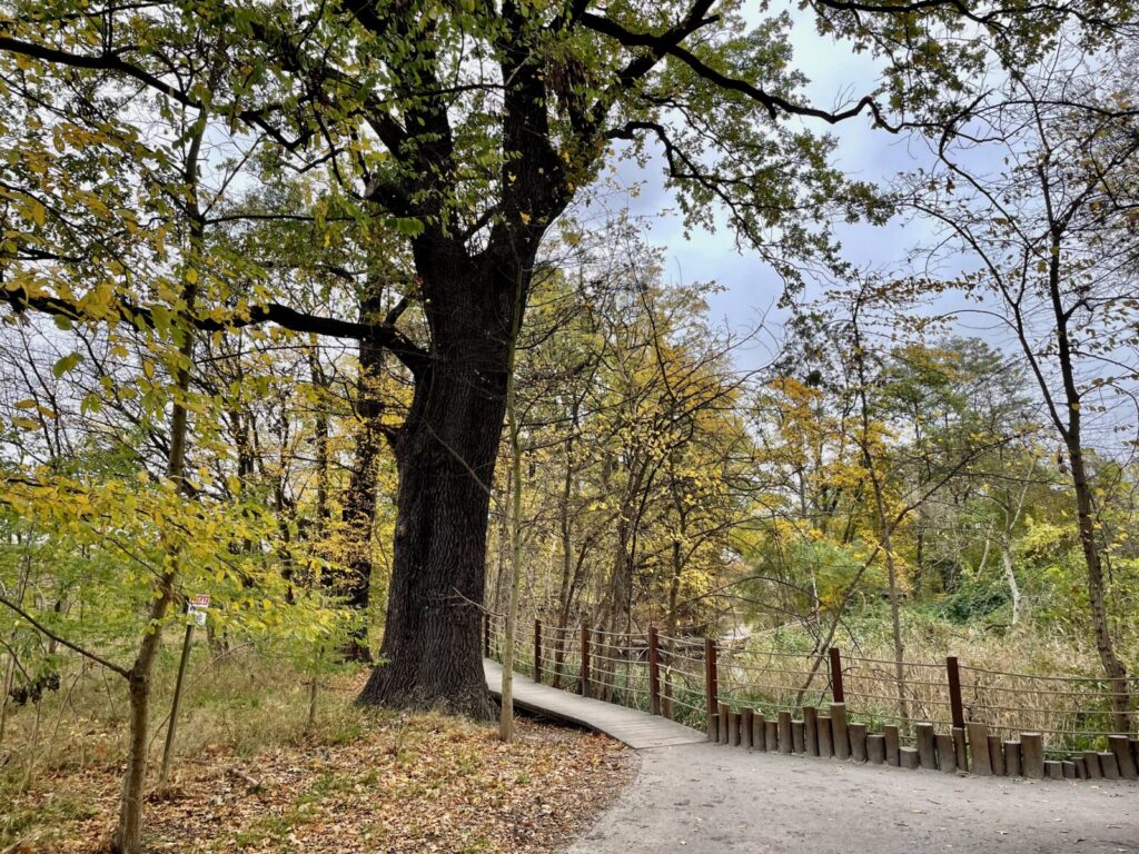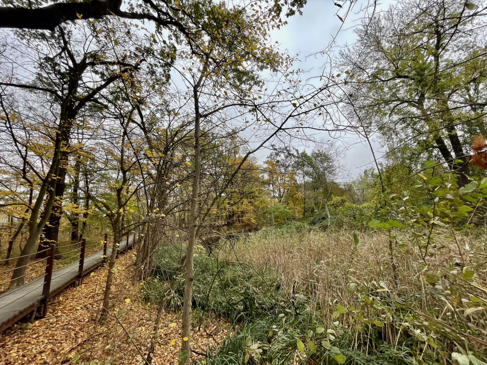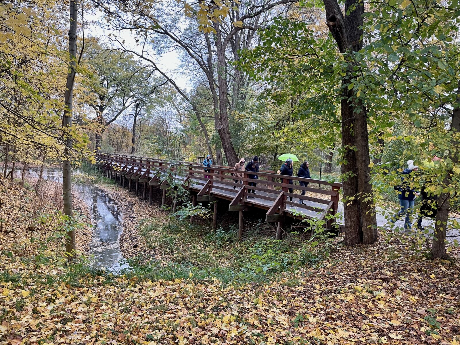 Kładki, po których poruszają się odwiedzający park, służą z jednej strony ich komfortowi, a z drugiej chronią systemy korzeniowe rosnących drzew i pozostałą roślinność przed uszkodzeniami. Ciekawa jest historia bobra, którą usłyszeliśmy zwiedzając park od Małgorzaty Syguda, Zastępczyni Kierownika Działu Przygotowania i Realizacji Inwestycji w ZZM we Wrocławiu. Bóbr aby móc przeciągnąć pień drzewa do swojej budowli na wodzie, przekopał się pod kładką stanowiącą barierę na jego trasie i w ten sposób osłabił jej konstrukcję, która nie spełniała już standardów bezpieczeństwa. Zarządca terenu wyremontował ją w ten sposób, by bóbr w dalszym ciągu mógł korzystać ze swojego korytarza, a spacerujący ludzie mogli robić to bezpiecznie – i podniósł ją nieco, zarazem umacniając nadwątloną wcześniej przez zwierzę konstrukcję.