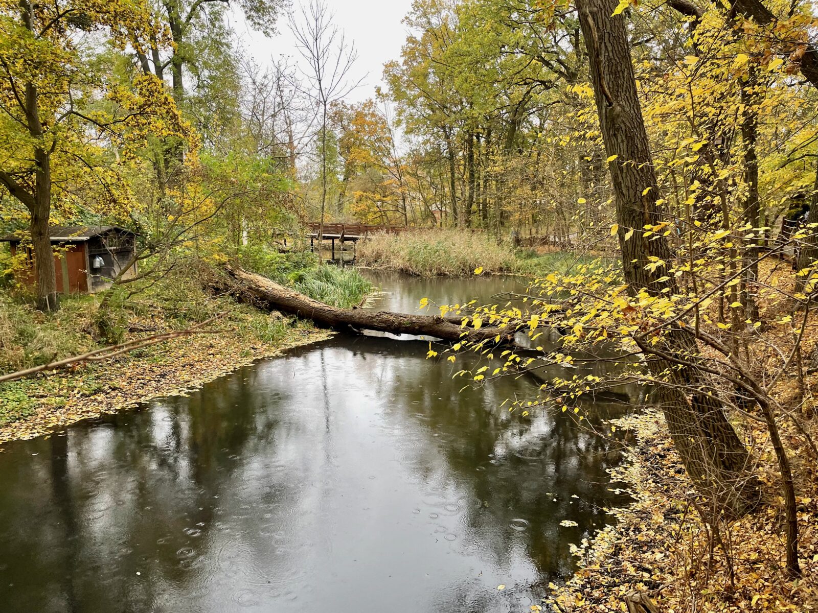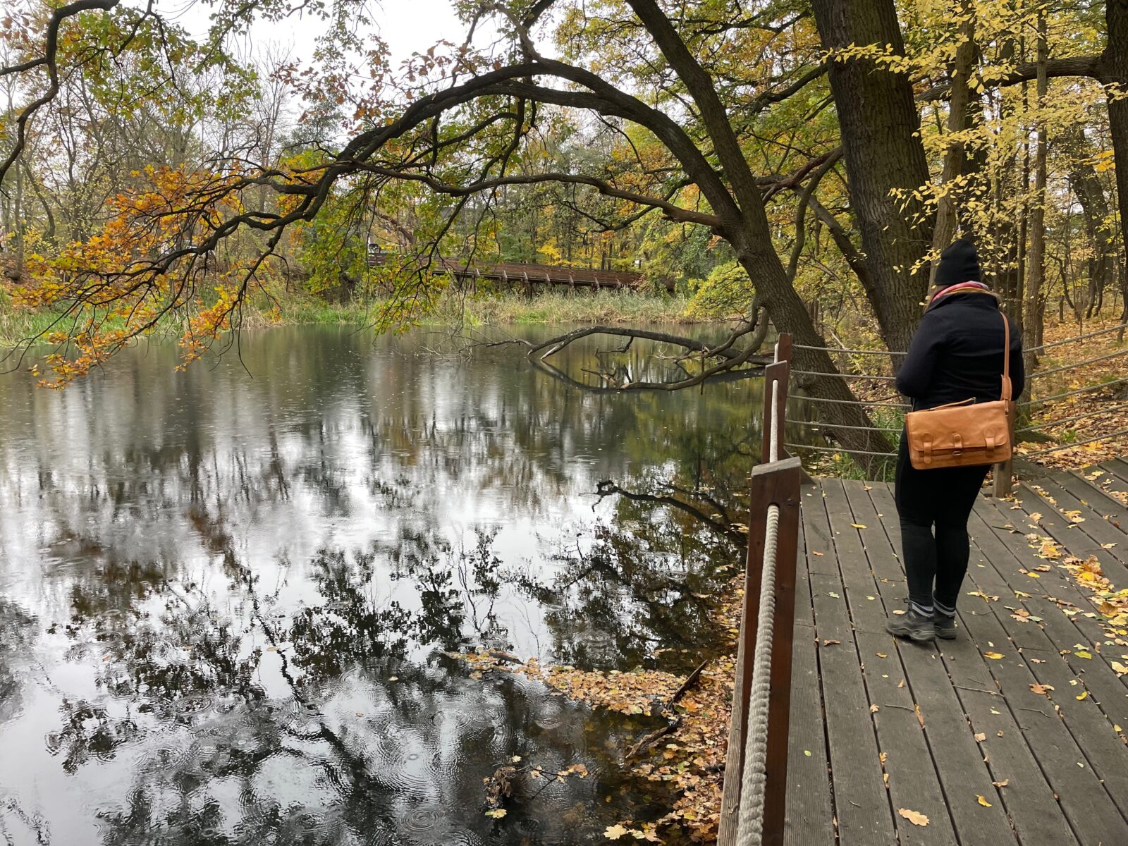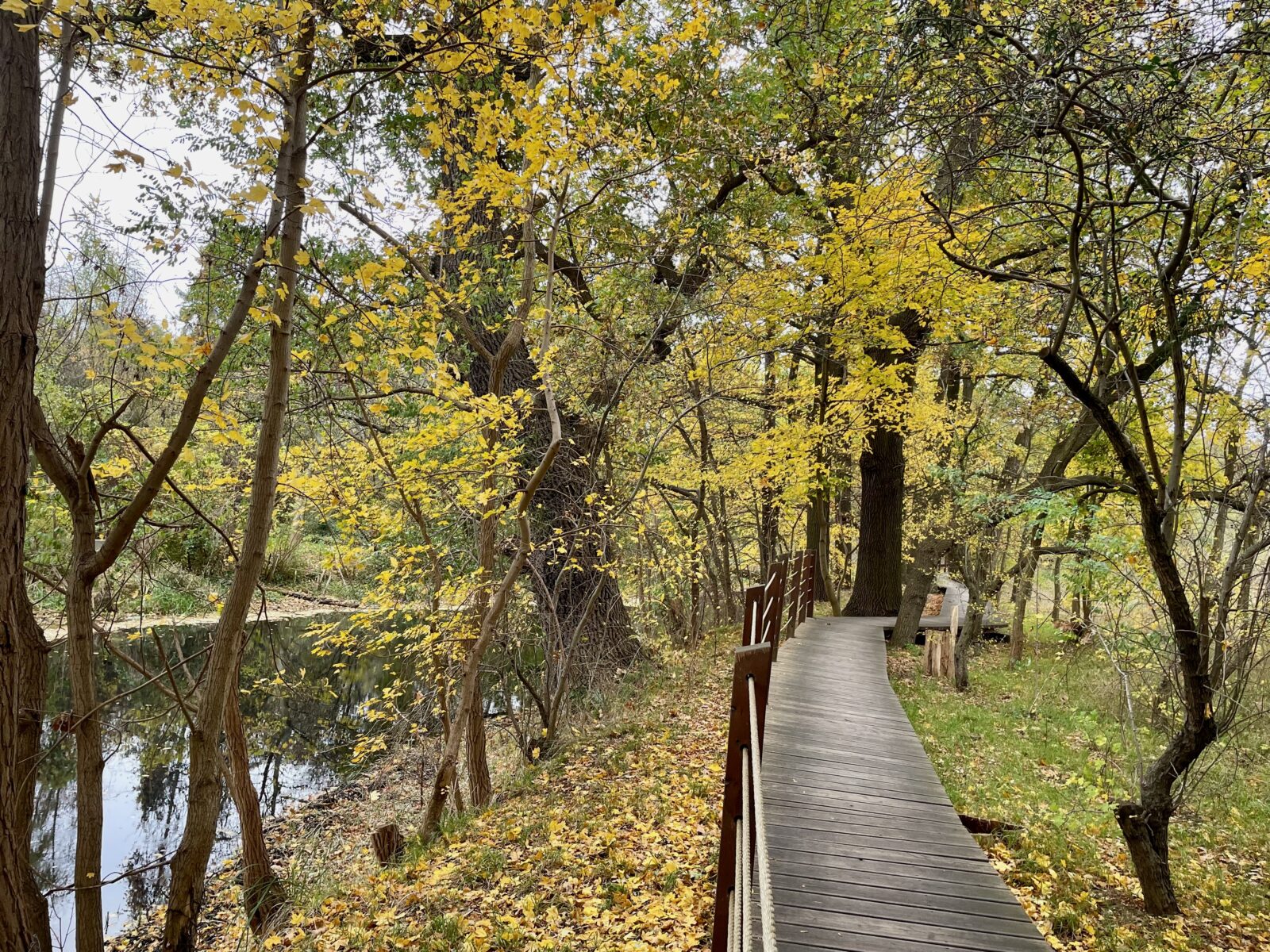 Kładki, po których poruszają się odwiedzający park, służą z jednej strony ich komfortowi, a z drugiej chronią systemy korzeniowe rosnących drzew i pozostałą roślinność przed uszkodzeniami. Ciekawa jest historia bobra, którą usłyszeliśmy zwiedzając park od Małgorzaty Syguda, Zastępczyni Kierownika Działu Przygotowania i Realizacji Inwestycji w ZZM we Wrocławiu. Bóbr aby móc przeciągnąć pień drzewa do swojej budowli na wodzie, przekopał się pod kładką stanowiącą barierę na jego trasie i w ten sposób osłabił jej konstrukcję, która nie spełniała już standardów bezpieczeństwa. Zarządca terenu wyremontował ją w ten sposób, by bóbr w dalszym ciągu mógł korzystać ze swojego korytarza, a spacerujący ludzie mogli robić to bezpiecznie – i podniósł ją nieco, zarazem umacniając nadwątloną wcześniej przez zwierzę konstrukcję.